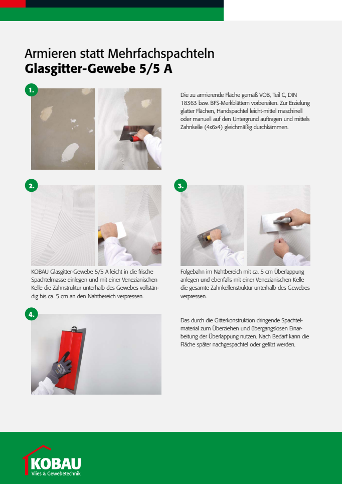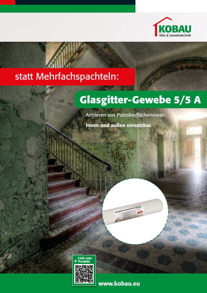 KOBAU Glasgitter-Gewebe 5/5 A dient zur Armierung von Putzen und Spachtelmassen bei Putzoberflächenrissen der Rissart A.1 entsprechend der Klassifizierung im BFS-Merkblatt Nr. 19.