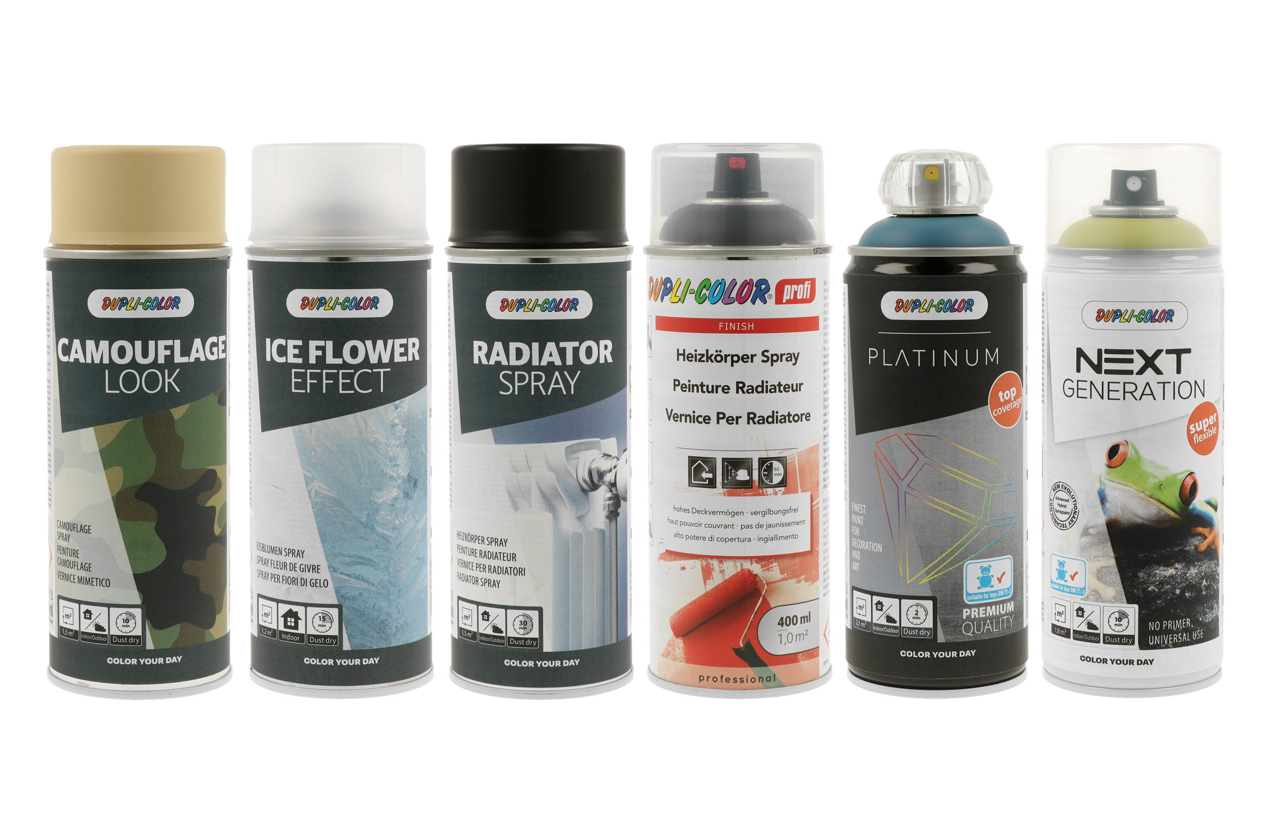 COLOR YOUR DAY mit neuen, ausgefallenen DUPLI-COLOR Effekten und Trendfarbtönen von European Aerosols - CAMOUFLAGE LOOK, ICE FLOWER EFFECT, HEIZKÖRPER SPRAY, PROFI HEIZKÖRPER SPRAY, PLATINUM, NEXT