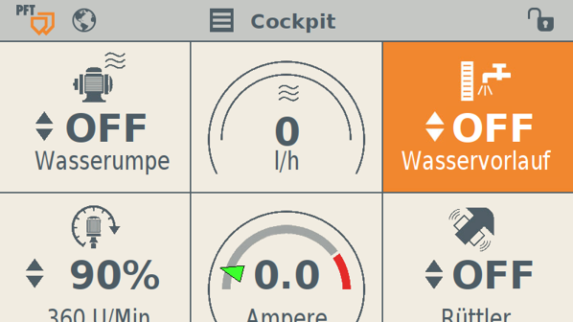 Dank der automatischen Druckregelung muss nur noch ein Einstellwert, der Solldruck der Maschine, eingegeben werden. Den Start- sowie Stoppdruck für die Materialabgabe zum Aufsprühen des Materials errechnet PFT Control automatisch. Der klare Vorteil der PFT Control-Steuerung iCON ist die übersichtliche, intuitive Bedienung für den Anwender.