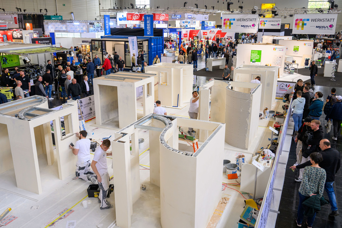 Tägliches Training der Nationalmannschaft der Stuckateure am Stand des Bundesverband Ausbau und Fassade.