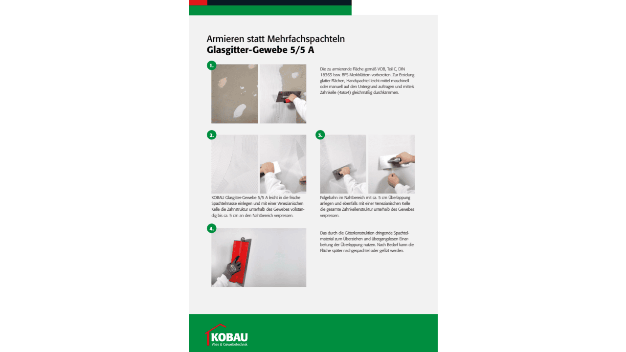 KOBAU Glasgitter-Gewebe 5/5 A is used for the reinforcementĀ of plasters and fillers in case of plaster surface cracks of type A.1 according to the classification in the BFS Notice No. 19.