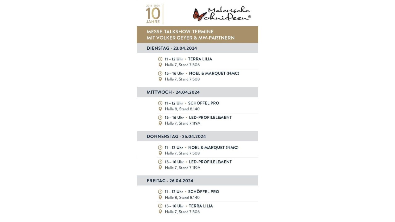 To celebrate the 10th anniversary of the partner network, "Malerische Wohnideen" is organising 8 exciting talk shows at FAF, 2 of which will take place at our NOËL & MARQUET stand (dates below). In open discussions with master painters and product partners, MW founder Volker Geyer and his guests promise exclusive insights into the past 10 years of the partner network, the latest product innovations and the challenges of the present and future for painting companies with topics such as employee retention, artificial intelligence and much more.